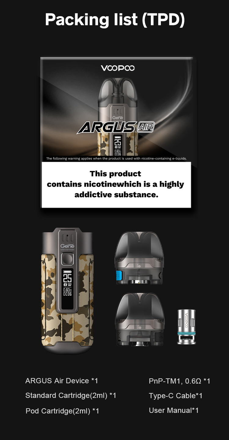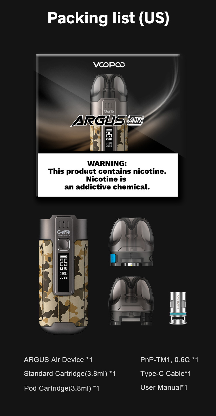 ADVERTENCIA: Este producto contiene nicotina.La nicotina es una sustancia química adictiva.Los productos que se muestran en el sitio web de VOOPOO son para el mercado internacional.Debido a las regulaciones, los productos disponibles para diferentes regiones pueden variar.Gracias por entender.