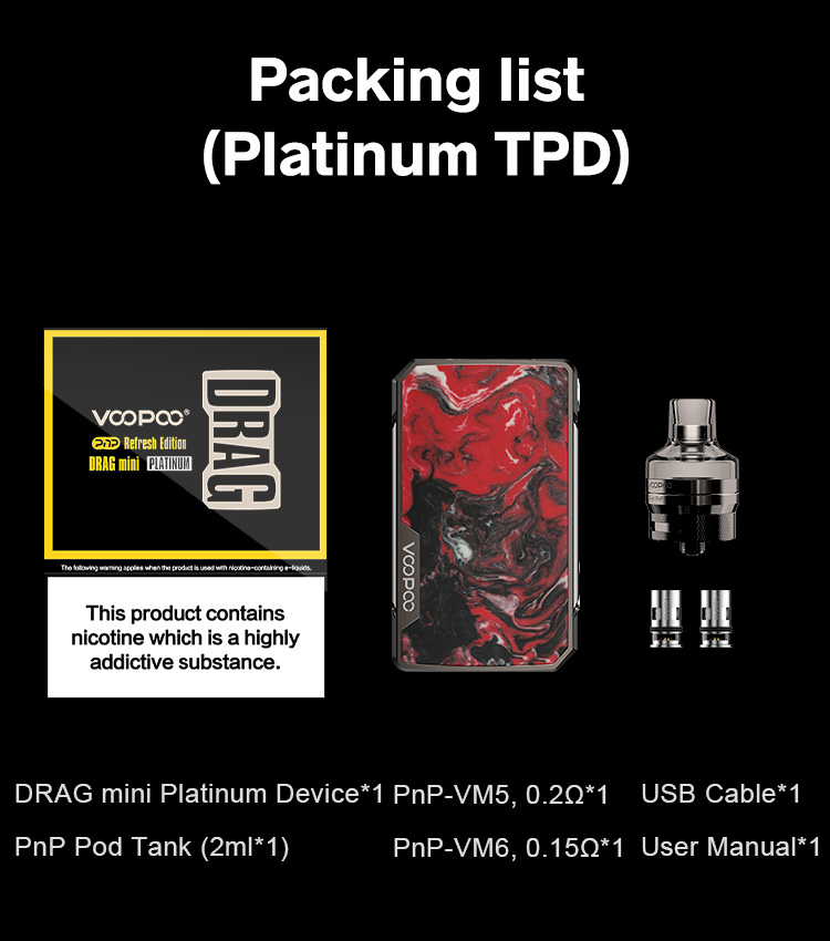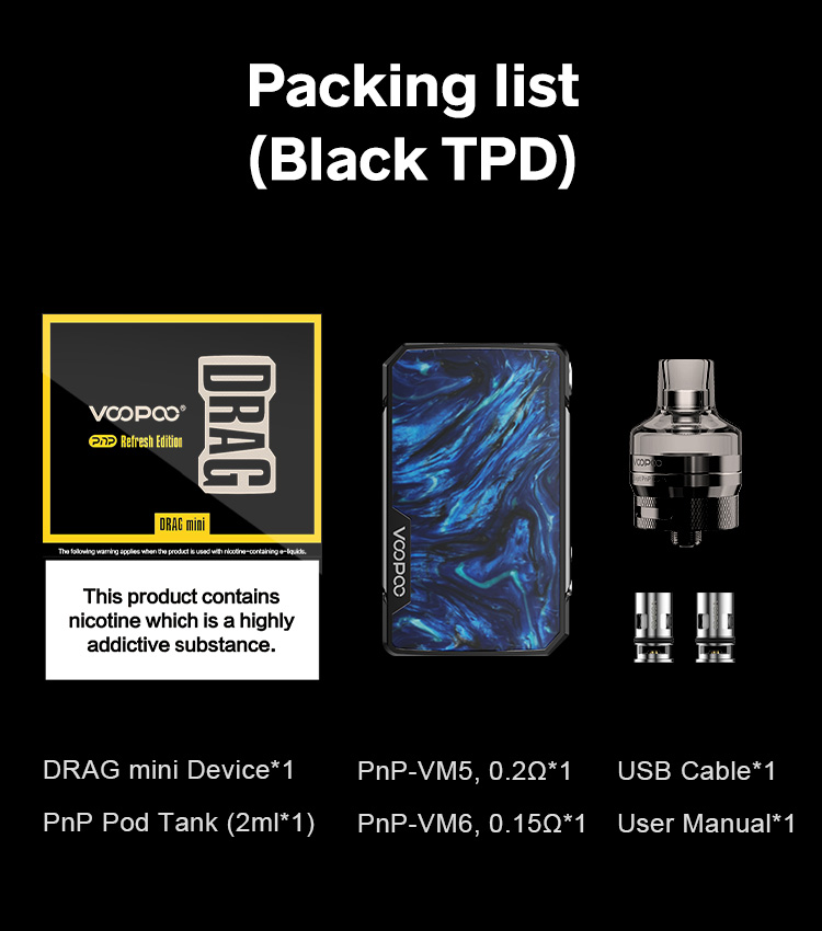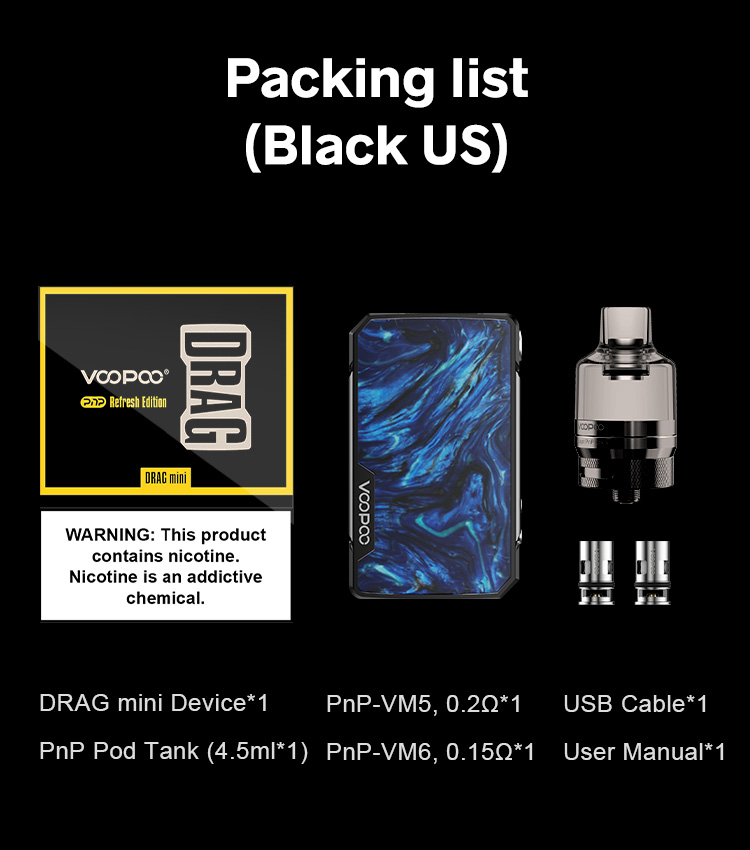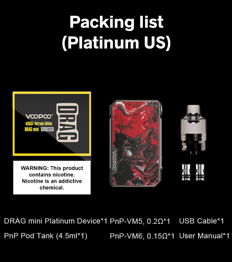 AVERTISSEMENT : Ce produit contient de la nicotine.La nicotine est un produit chimique addictif.Les produits affichés sur le site VOOPOO sont destinés au marché international.En raison des réglementations, les produits disponibles pour différentes régions peuvent varier.Merci de votre compréhension.