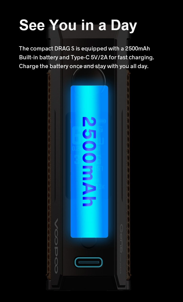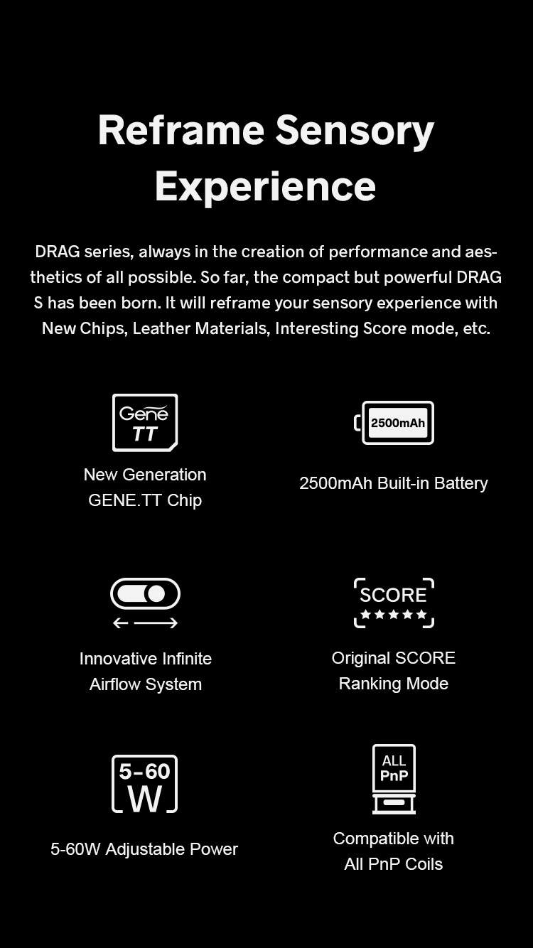 La petite taille de DRAG S contient une énorme énergie.La puissance réglable de 5 à 60 W peut vous apporter des saveurs riches et un nuage dense en 0,001 seconde.