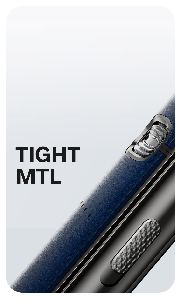 VMATE E’s streamlined curve is made possible with elegant metal. The body is polished in 14 processes over 150 minutes to form the smoothness and gloss. The leather offers the optimal touch feeling and luxury style. The LED indicator lights on and off with each puff, showing the real-time battery capacity.