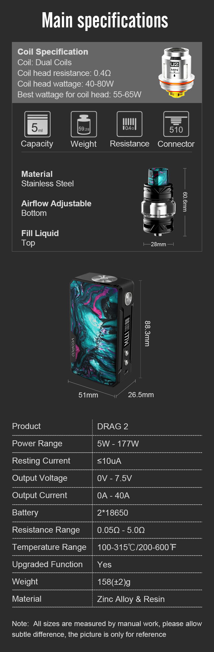 Zgodnie z tą samą konstrukcją i solidną jakością DRAG, DRAG 2 mod jest smuklejszy i 1/4 lżejszy niż jego poprzednik, dzięki czemu jest bardziej przyjazny w codziennym użytkowaniu.Największa optymalizacja tego modu ma miejsce wewnętrznie.