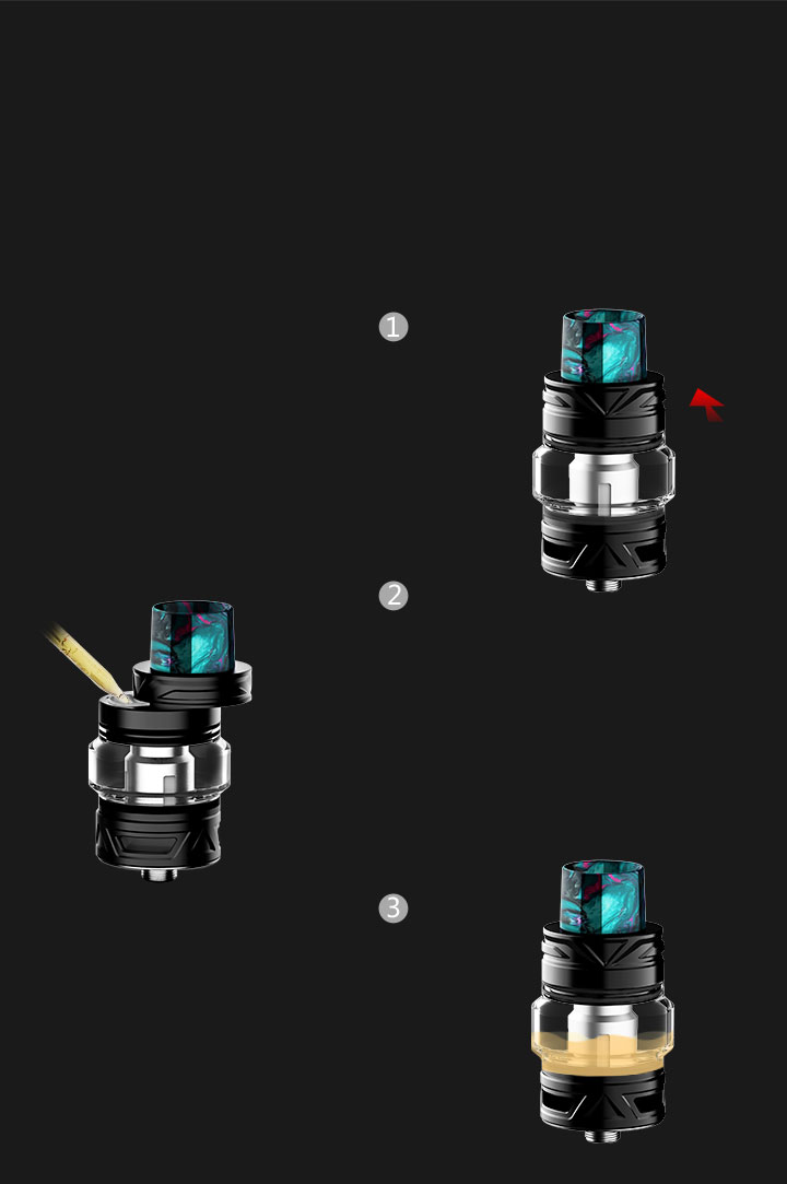 Może skutecznie zapobiegać wyciekom e-soku, naciskając górną nasadkę i napełniając e-ciecz, co jest wygodniejsze i czystsze