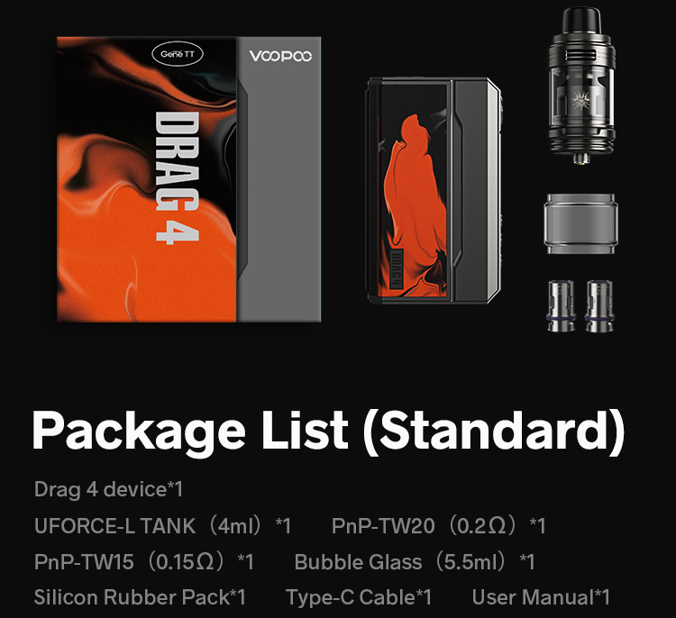 DRAG 4 - это 4-е поколение VOOPOO DRAG IP в усовершенствованном моде, отличающееся дизайном опережающим своё время, включающим твердые древесные элементы в сочетании с оригинальным атомайзером UFORCE-L Tank с герметичным верхним воздуховодом. Его срок службы увеличивается за счет использования испарителей PnP Dual In One, что позволяет наслаждаться плотными облаками пара и восхитительным вкусом, при этом обладая сниженным расходом жидкости.