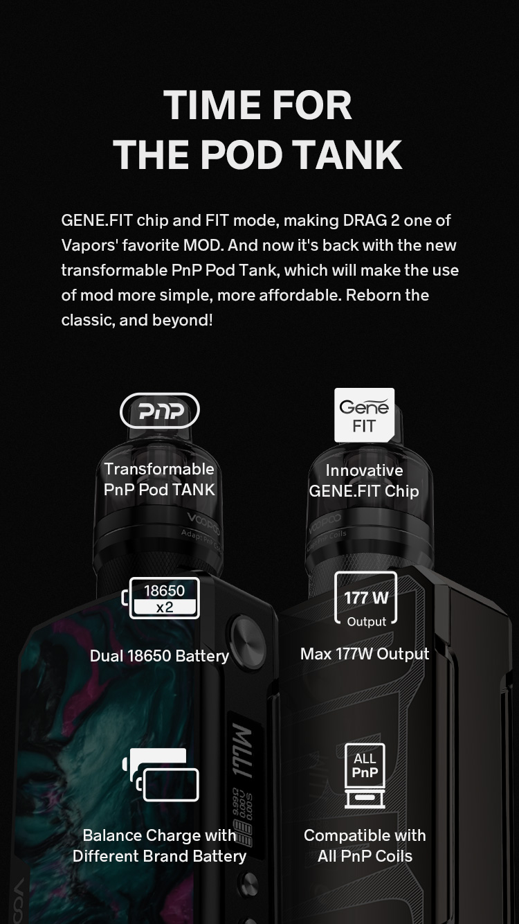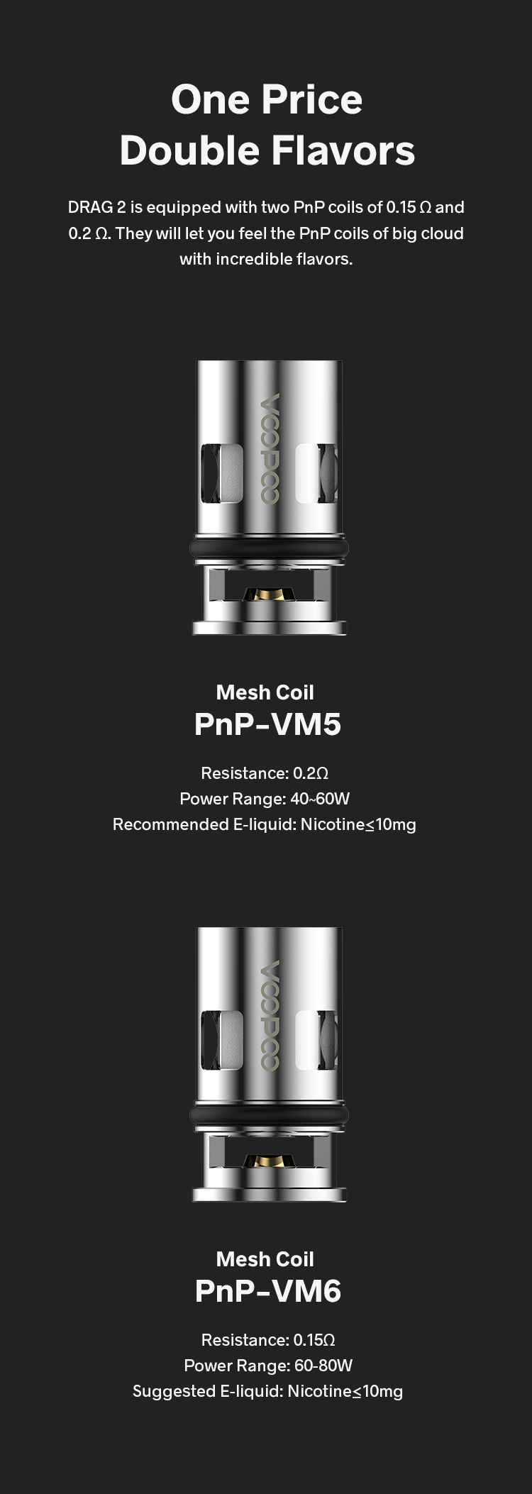 DRAG 2 tương thích với tất cả các cuộn dây PnP, chỉ cần kéo và đẩy, bạn có thể tận hưởng trải nghiệm vaping khác nhau, nhanh chóng và giá cả phải chăng.